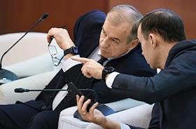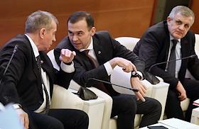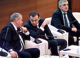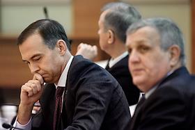 Parliamentary hearings of the faction of the Communist Party of the Russian Federation on the topic: "On topical issues of the development of the fuel and energy complex of Russia" in the Small Hall of the State Duma of Russia. From left to right: First Deputy Chairman of the Russian State Duma Committee on Energy Sergei Levchenko, First Deputy Chairman of the Russian State Duma Committee on Security and Anti-Corruption Yuri Afonin and First Deputy Chairman of the State Duma Committee on Labour, Social Policy and Veterans Affairs Nikolai Kolomeytsev during hearings.