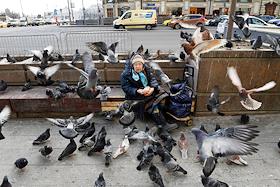 Genre photography. An elderly woman feeds pigeons in the city center.