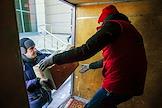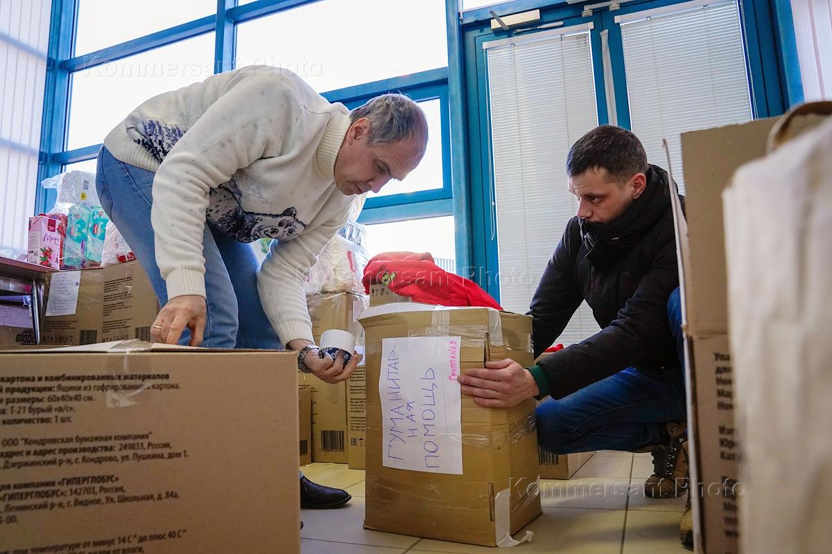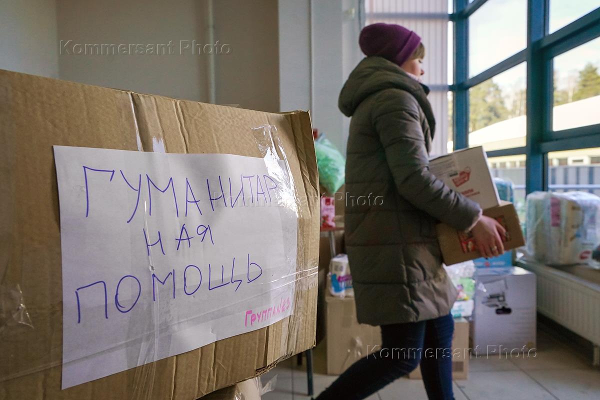 Отправка гуманитарной помощи беженцам с Донбасса из пункта сбора на стадионе "Балашиха Арена" в основной пункт передачи в городе Реутове.