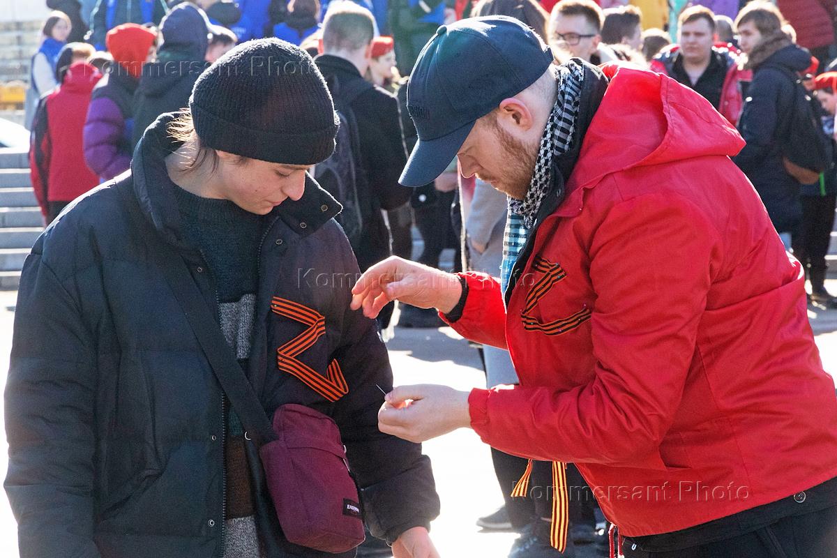 Концерта в честь 8-ой годовщины присоединения Крыма и в поддержку российской армии в спортивном комплексе "Юбилейный". Люди перед началом концерта нашивают на одежду георгиевскую ленту в форме буквы "Z".