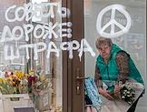 Виды Санкт-Петербурга. Жанровая фотография. Антивоенный значок "Пацифик" и лозунг "Совесть дороже штрафа" на витрине цветочного ларька.