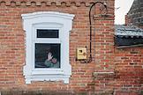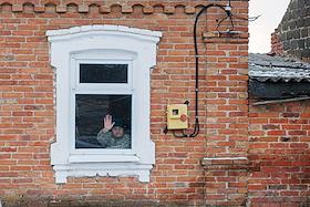 Политическая обстановка в Донецкой Народной Республики (ДНР) в период проведения специальной военной операции Вооруженных Сил России на Украине. Виды освобожденного села Анодоль. Жанровая фотография. Пожилая женщина смотрит в окно.