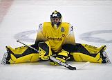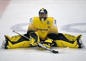 Континентальная хоккейная лига (КХЛ). Чемпионат сезона 2021/22. 1/4 финала - Запад. Матч между командами "Динамо" (Москва) - "Северсталь" (Череповец) на стадионе "ВТБ Арена". Вратарь команды "Северсталь" Дмитрий Шугаев во время матча.