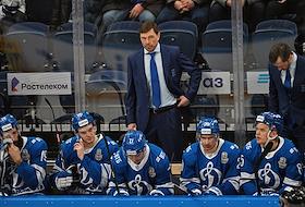 Континентальная хоккейная лига (КХЛ). Чемпионат сезона 2021/22. 1/4 финала - Запад. Матч между командами "Динамо" (Москва) - "Северсталь" (Череповец) на стадионе "ВТБ Арена". Главный тренер команды "Динамо" Алексей Кудашов (в центре) во время матча.