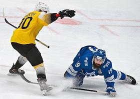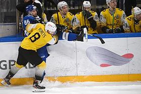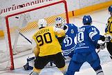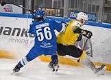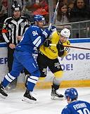 Континентальная хоккейная лига (КХЛ). Чемпионат сезона 2021/22. 1/4 финала - Запад. Матч между командами "Динамо" (Москва) - "Северсталь" (Череповец) на стадионе "ВТБ Арена". Игрок команды "Северсталь" Якоб Стенквист (справа) и игрок команды "Динамо" Александр Петунин (слева) во время матча.