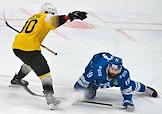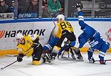 Континентальная хоккейная лига (КХЛ). Чемпионат сезона 2021/22. 1/4 финала - Запад. Матч между командами "Динамо" (Москва) - "Северсталь" (Череповец) на стадионе "ВТБ Арена". Игрок команды "Динамо" Андрей Миронов (второй слева) и игрок команды "Северсталь" Игорь Гераськин (справа) во время матча.