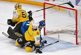 Континентальная хоккейная лига (КХЛ). Чемпионат сезона 2021/22. 1/4 финала - Запад. Матч между командами "Динамо" (Москва) - "Северсталь" (Череповец) на стадионе "ВТБ Арена". Игроки команды "Северсталь" вратарь Владислав Подъяпольский (слева) и Макар Хабаров (справа) во время матча.