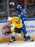 Континентальная хоккейная лига (КХЛ). Чемпионат сезона 2021/22. 1/4 финала - Запад. Матч между командами "Динамо" (Москва) - "Северсталь" (Череповец) на стадионе "ВТБ Арена". Игрок команды "Северсталь" Никита Гуслистов (слева) во время матча.