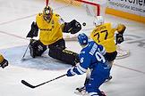 Континентальная хоккейная лига (КХЛ). Чемпионат сезона 2021/22. 1/4 финала - Запад. Матч между командами "Динамо" (Москва) - "Северсталь" (Череповец) на стадионе "ВТБ Арена". Вратарь команды "Северсталь" Владислав Подъяпольский (слева) во время матча.