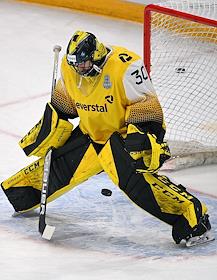 Континентальная хоккейная лига (КХЛ). Чемпионат сезона 2021/22. 1/4 финала - Запад. Матч между командами "Динамо" (Москва) - "Северсталь" (Череповец) на стадионе "ВТБ Арена". Вратарь команды "Северсталь" Дмитрий Шугаев во время матча.