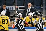 Континентальная хоккейная лига (КХЛ). Чемпионат сезона 2021/22. 1/4 финала - Запад. Матч между командами "Динамо" (Москва) - "Северсталь" (Череповец) на стадионе "ВТБ Арена". Главный тренер команды "Северсталь" Андрей Разин (в центре) во время матча.