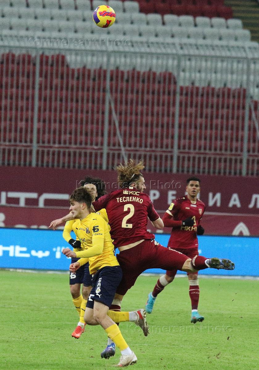 Российская Премьер-Лига (РПЛ). Тинькофф - Чемпионат России по футболу 2021/2022. 21-й тур. Матч между командами "Рубин" (Казань) - "Ростов" (Ростов-на-Дону) на стадионе "Казань Арена". Игрок команды "Рубин" Александр Ломовицкий (в центре) и игрок команды "Ростов" Хорен Байрамян (справа) во время матча.