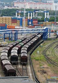 Перегрузка и хранение зерна в морском порту Новороссийска. Глубоководный зерновой терминал на территории АО "КСК". Составы вагонов-зерновозов на железнодорожной ветке терминала.