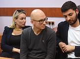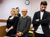 Заседание по административному делу редактора "Первого канала" Марины Овсянниковой, обвиняемой по статье 20.2 КоАП РФ "Нарушение установленного порядка организации либо проведения собрания, митинга, демонстрации, шествия или пикетирования", в Останкинском районном суде. Редактор "Первого канала" Марина Овсянникова (слева) и адвокаты Антон Гашинский (в центре) и Анри Цискаришвили во время заседания суда.