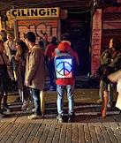 Благотворительный концерт для помощи украинским беженцам рэп-исполнителя Oxxxymiron (Мирона Федорова) в клубе Kadıköy Sahne в Стамбуле. Мужчина со светодиодным антиядерным знаком на рюкзаке у входа в клуб.
