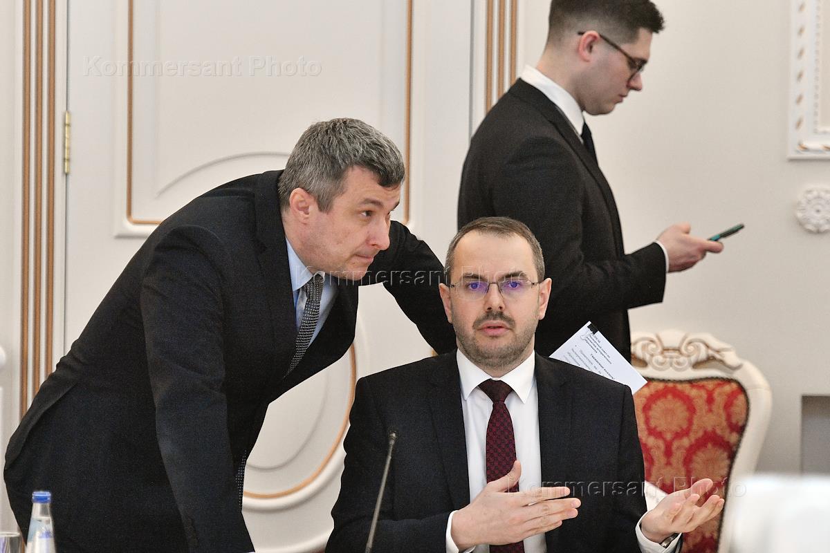 The first meeting of the Expert Council for the Development of History Education under the Ministry of Education and Science of Russia in the Collegium Hall. Chairman of the Board of the Russian Historical Society, Executive Manager of the History of the Fatherland Foundation Konstantin Mogilevsky (right) and Minister of Science and Higher Education of Russia Valery Falkov (left) during a meeting.