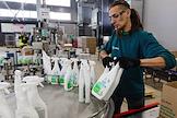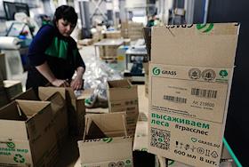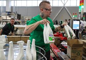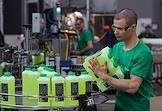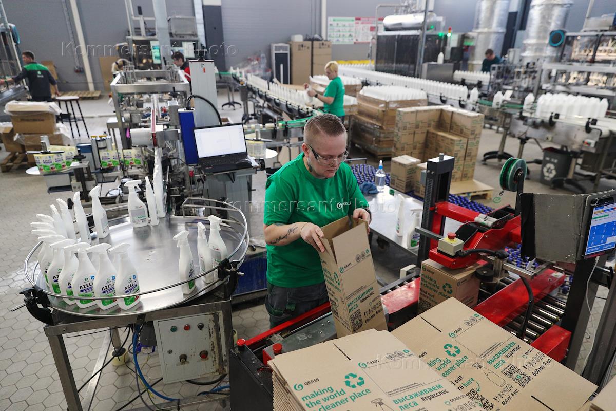 The work of the plant company "GRASS" for the production of auto chemicals, auto cosmetics, detergents for cleaning and household chemicals. Employees in the packaging area.