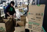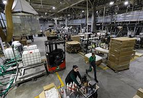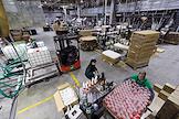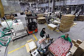 The work of the plant company "GRASS" for the production of auto chemicals, auto cosmetics, detergents for cleaning and household chemicals. Employees in the warehouse of finished products.