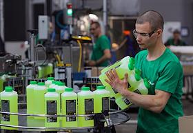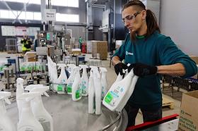 The work of the plant company "GRASS" for the production of auto chemicals, auto cosmetics, detergents for cleaning and household chemicals. Employees in the production shop.