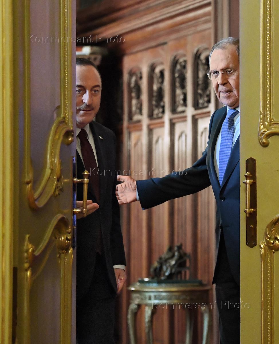 Переговоры Министра иностранных дел России Сергея Лаврова с министром иностранных дел Турецкой Республики Мевлютом Чавушоглу в Доме приемов МИД России. Министр иностранных дел России Сергей Лавров (справа) и министр иностранных дел Турецкой Республики Мевлют Чавушоглу (слева) перед началом переговоров.