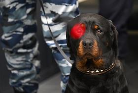 Рассмотрение апелляционной жалобы на приговор бывшим полицейским, признанных виновными в подбросе журналисту Ивану Голунову наркотиков в Первом апелляционном суде общей юрисдикции. Жанровая фотография. Кинолог с собакой породы ротвейлер в здании суда.
