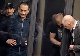 Рассмотрение апелляционной жалобы на приговор бывшим полицейским, признанных виновными в подбросе журналисту Ивану Голунову наркотиков в Первом апелляционном суде. Бывшие полицейские Роман Феофанов (в центре) и Максим Уметбаев (слева) на скамье подсудимых во время заседания суда.