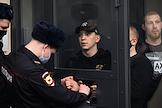 Рассмотрение апелляционной жалобы на приговор бывшим полицейским, признанных виновными в подбросе журналисту Ивану Голунову наркотиков в Первом апелляционном суде общей юрисдикции. Жанровая фотография. Руки обвиняемого, на которые одевают наручники.