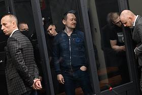Рассмотрение апелляционной жалобы на приговор бывшим полицейским, признанных виновными в подбросе журналисту Ивану Голунову наркотиков в Первом апелляционном суде общей юрисдикции. Бывшие полицейские Максим Уметбаев (в центре) и Игорь Ляховец (справа) на скамье подсудимых во время заседания суда.