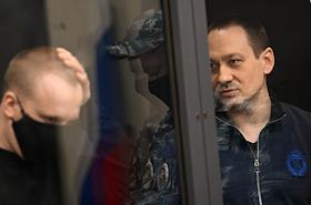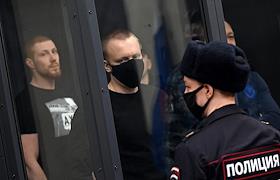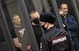 Рассмотрение апелляционной жалобы на приговор бывшим полицейским, признанных виновными в подбросе журналисту Ивану Голунову наркотиков в Первом апелляционном суде общей юрисдикции. Бывшие полицейские Максим Уметбаев (в центре) и Игорь Ляховец (справа) на скамье подсудимых во время заседания суда.
