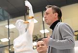 Рассмотрение апелляционной жалобы на приговор бывшим полицейским, признанных виновными в подбросе журналисту Ивану Голунову наркотиков в Первом апелляционном суде общей юрисдикции. Жанровая фотография. Кинолог с собакой породы ротвейлер в здании суда.