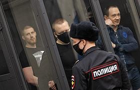 Рассмотрение апелляционной жалобы на приговор бывшим полицейским, признанных виновными в подбросе журналисту Ивану Голунову наркотиков в Первом апелляционном суде общей юрисдикции. Слева направо: бывшие полицейские Акбар Сергалиев, Игорь Ляховец и Максим Уметбаев на скамье подсудимых во время заседания суда.