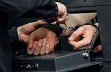 Рассмотрение апелляционной жалобы на приговор бывшим полицейским, признанных виновными в подбросе журналисту Ивану Голунову наркотиков в Первом апелляционном суде общей юрисдикции. Жанровая фотография. Руки обвиняемого, на которые одевают наручники.