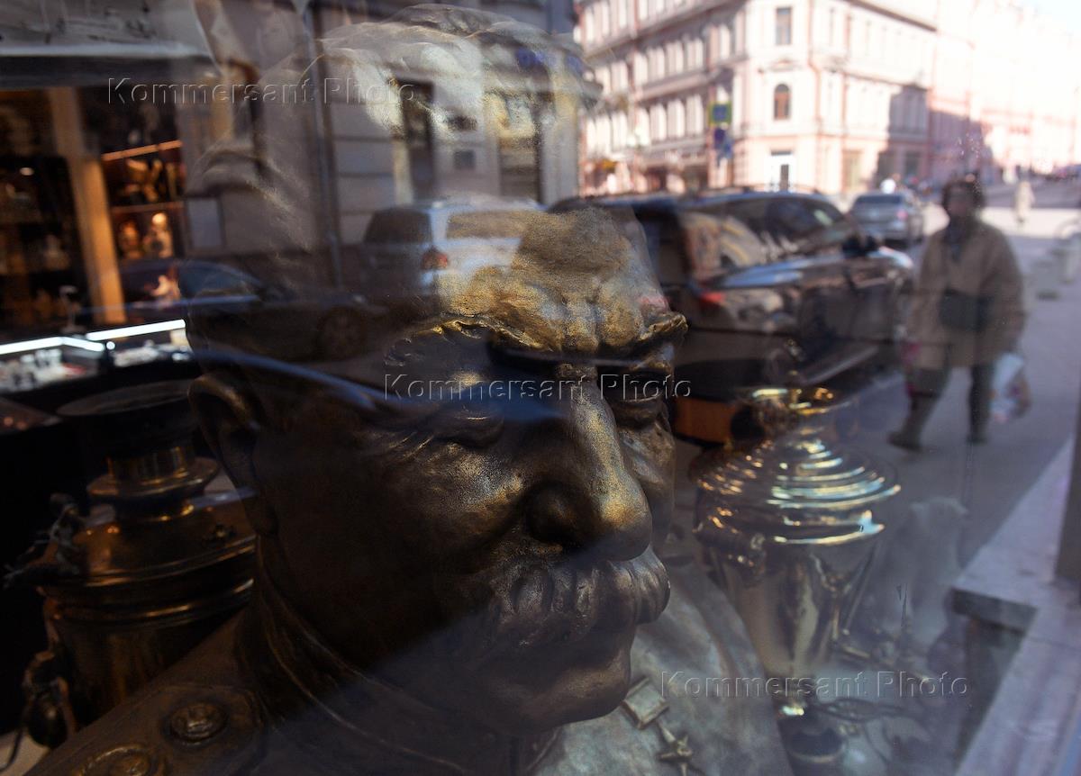 Виды Москвы. Улица Арбат. Жанровая фотография. Бюст Иосифа Сталина в витрине сувенирного магазина.