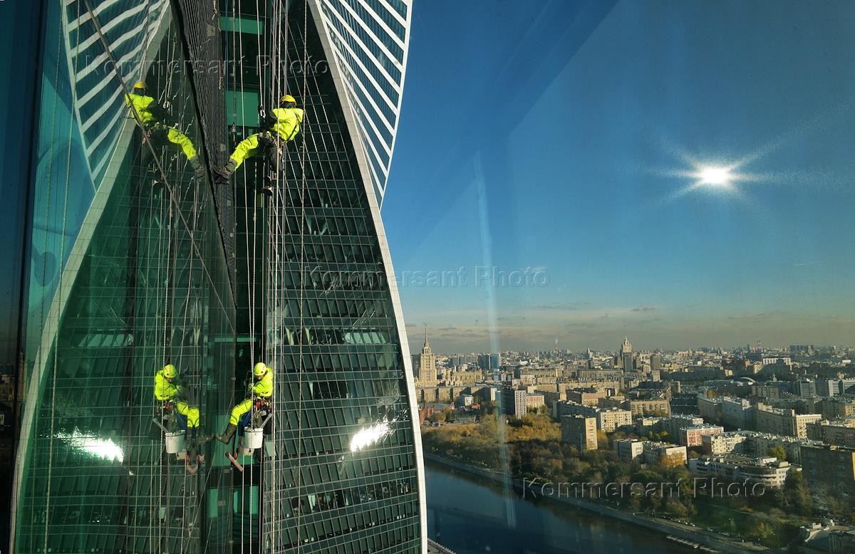 Жанровая фотография. Промышленные альпинисты во время мытья окон на башне Московского международного делового центра "Москва-сити".