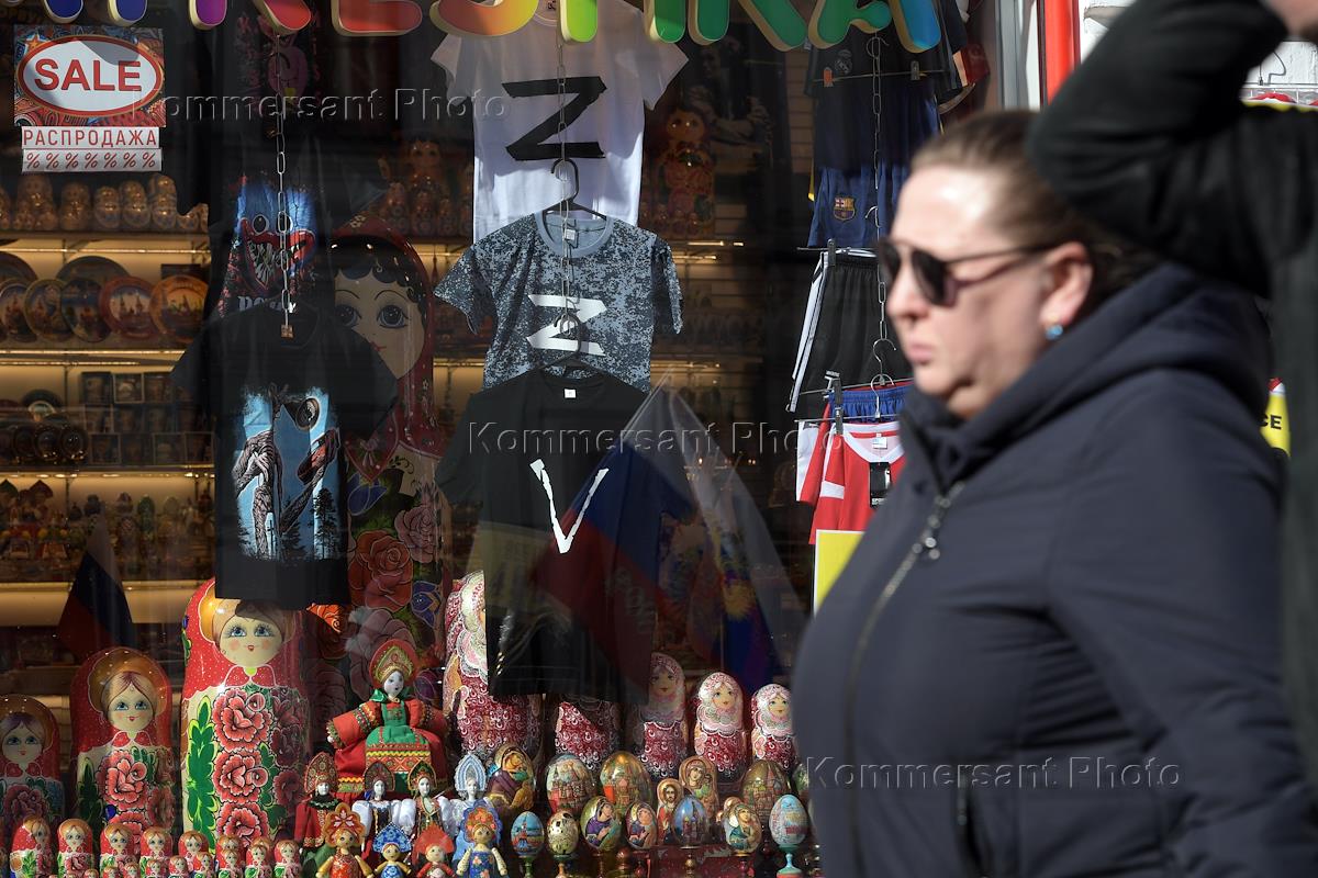 Views of Moscow. Arbat street. Genre photography. T-shirts with the letters "Z" and "V" in the window of a gift shop.