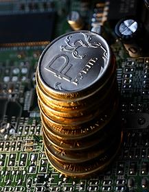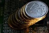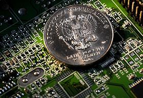 Криптовалюта. Жанровая фотография. Монета 1 рубль на плате.
