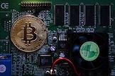 Криптовалюта. Жанровая фотография. Bitcoin (биткойн) на плате.