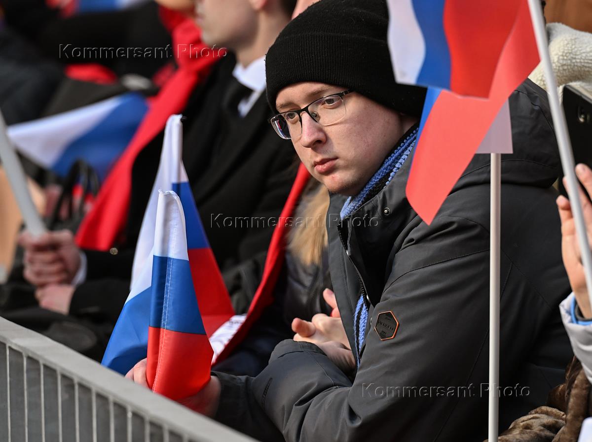 Концерт-митинг "Za мир без нацизма! Zа Россию! Zа Президентa!", посвященный дню воссоединения Крыма с Россией, на большой спортивной арене "Лужники". Зрители во время митинга-концерта.
