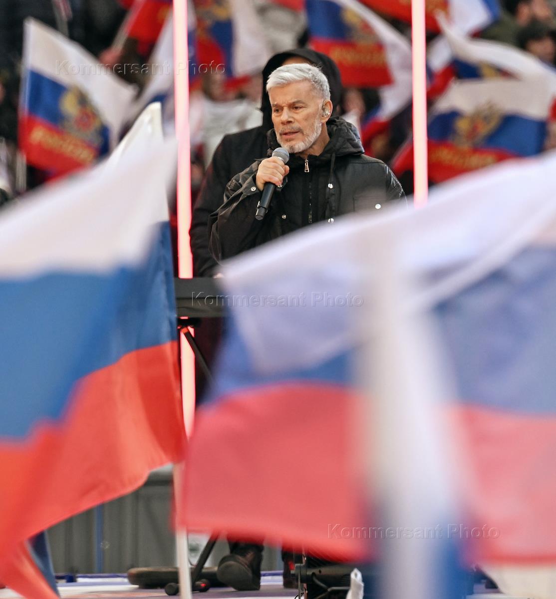 Концерт-митинг "Za мир без нацизма! Zа Россию! Zа Президентa!", посвященный дню воссоединения Крыма с Россией, на большой спортивной арене "Лужники". Певец Николай Басков во время выступления на концерте-митинге.