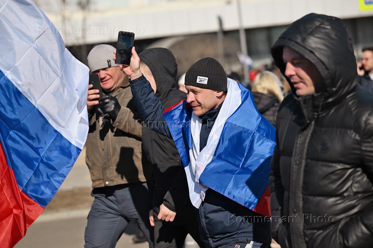 Концерт-митинг "Za мир без нацизма! Zа Россию! Zа Президентa!", посвященный дню воссоединения Крыма с Россией, на большой спортивной арене "Лужники". Ситуация у спортивной арены "Лужники". Зрители перед началом митинга-концерта.