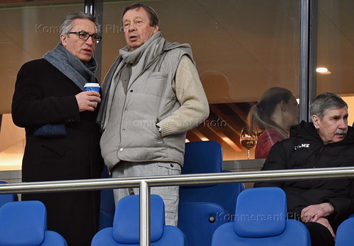 Российская Премьер-Лига (РПЛ). Тинькофф - Чемпионат России по футболу 2021/2022. 22-й тур. Матч между командами "Динамо" (Москва) - "Ростов" (Ростов-на-Дону) на стадионе "ВТБ Арена" - Центральный стадион Динамо имени Льва Яшина. Футбольный тренер Юрий Семин (второй слева) на зрительской трибуне перед началом матча.