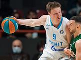 Единая лига ВТБ 2021/2022. Матч между командами УНИКС (Казань) - "Зенит" (Санкт-Петербург) на стадионе "Баскет-холл". Игрок команды "Зенит" Дмитрий Кулагин (слева) во время матча.