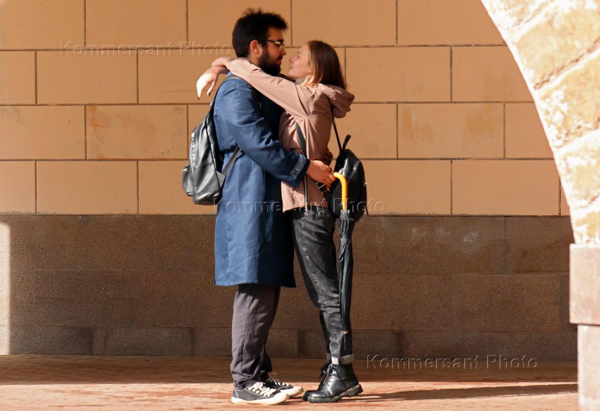 Views of Kazan. Genre photography. Visitors to the Tycyachiletiya Park are photographed against the backdrop of flowering trees.