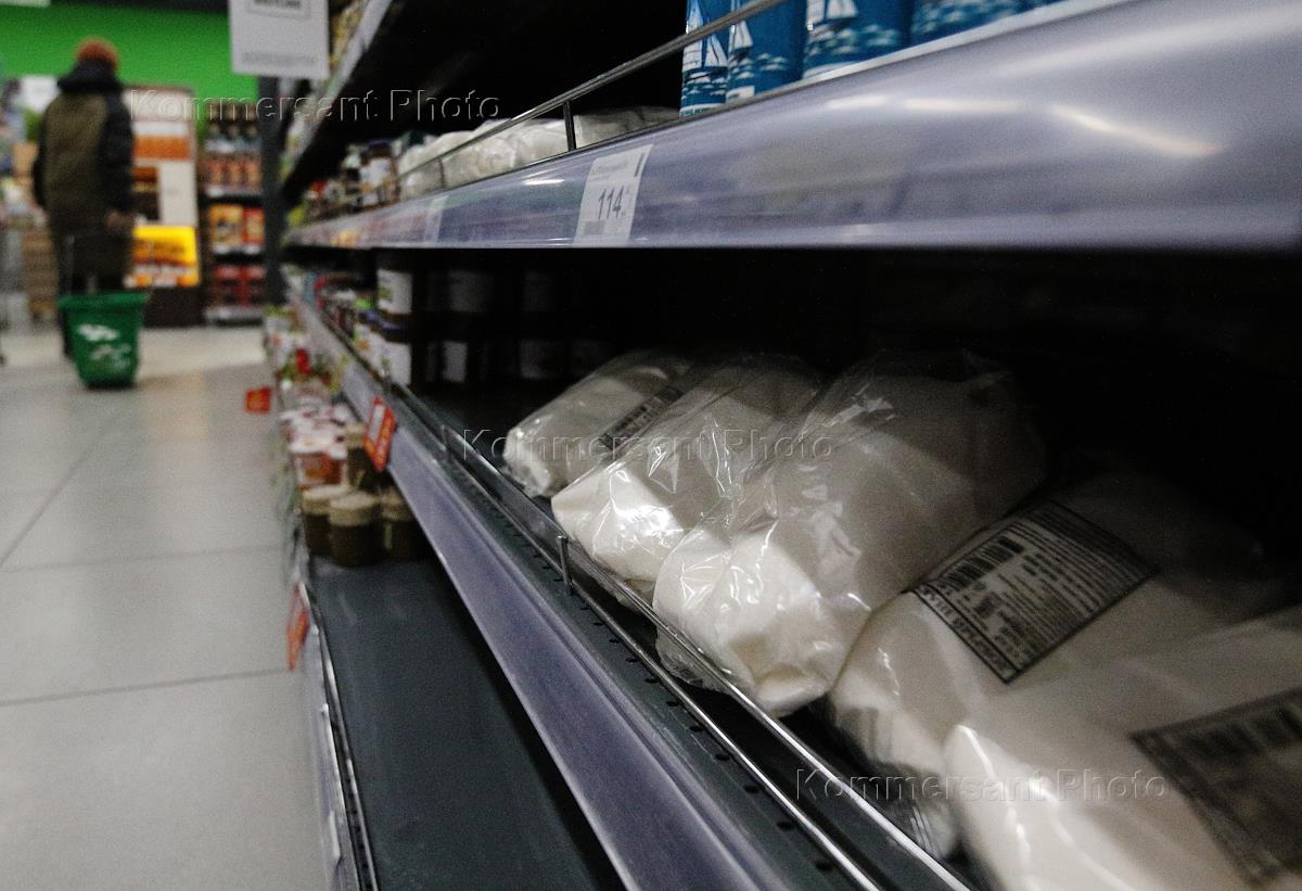 Genre photography. Bags of granulated sugar on a shelf in a Perekrestok store.