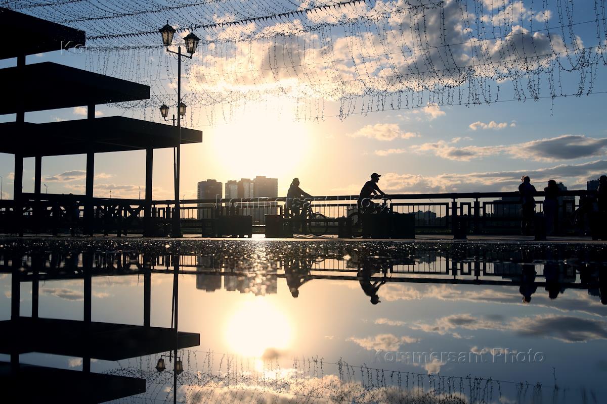 Views of Kazan. Genre photography. Cyclists during a bike ride along the Kremlin embankment at sunset.