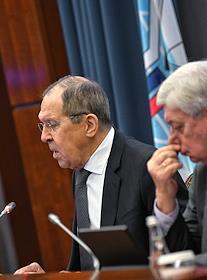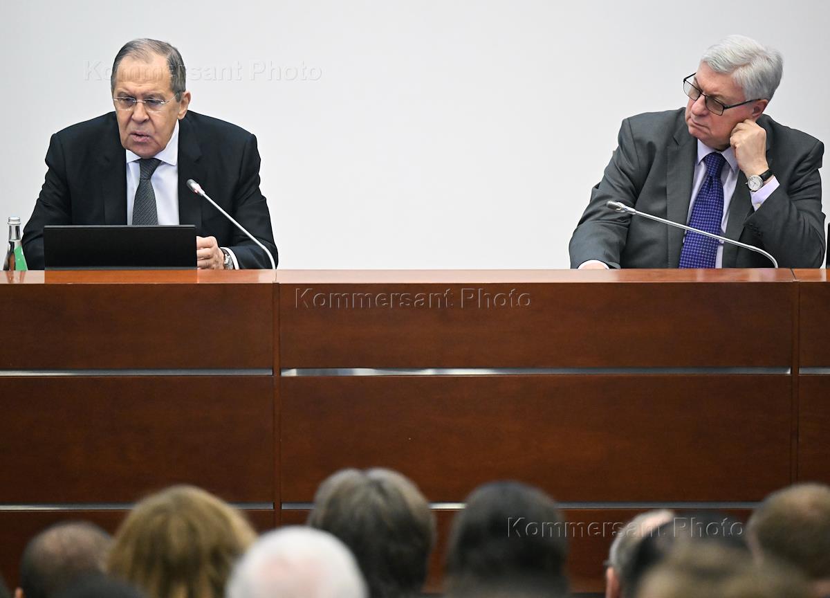 Встреча министра иностранных дел России Сергея Лаврова во время встречи со студенческо-преподавательским составом Московского государственного института международных отношений (университет) (МГИМО) МИД России в МГИМО МИД России. Министр иностранных дел России Сергей Лавров (справа) и ректор МГИМО Анатолий Торкунов (слева) во время встречи.