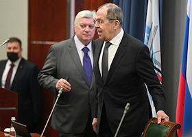 Встреча министра иностранных дел России Сергея Лаврова во время встречи со студенческо-преподавательским составом Московского государственного института международных отношений (университет) (МГИМО) МИД России в МГИМО МИД России. Министр иностранных дел России Сергей Лавров (слева) и ректор МГИМО Анатолий Торкунов (справа) во время встречи.