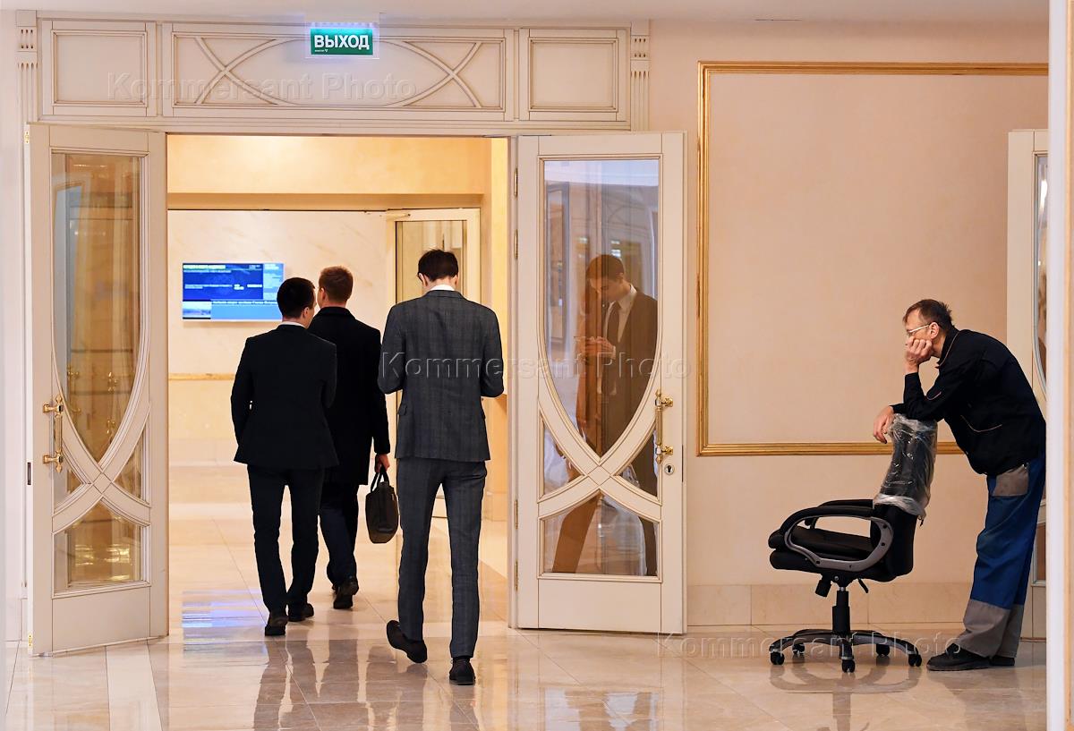 Пленарное заседание Совета Федерации России. Сенаторы перед заседанием Совета Федерации России. Жанровая фотография. В холле здания Совета Федерации.