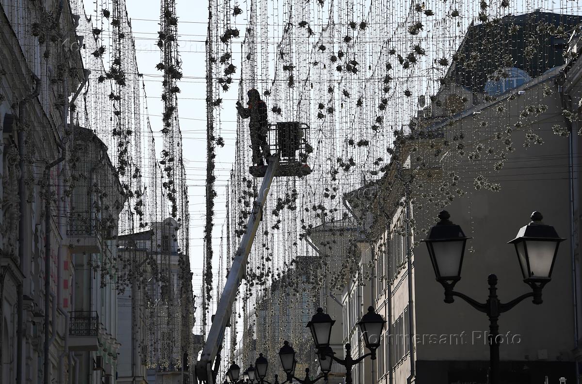 Виды Москвы. Жанровая фотография. Ремонтные работы гирлянд на улице Кузнецкий мост.