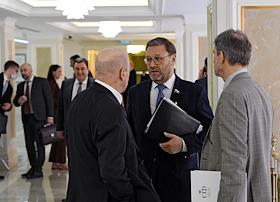 Пленарное заседание Совета Федерации России. Сенаторы перед заседанием Совета Федерации России. Представитель в Совете Федерации России от законодательного органа государственной власти Ивановской области Александр Гусаковский (в центре) перед началом заседания.